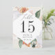 Boho chic floral table number cards feature a diamond shaped border of sage green watercolor foliage and flowers in soft desert inspired hues of peach, ivory, and white, framing your table number in rich charcoal. Personalize with your names and wedding date, or name each table for an extra personal touch. Design repeats on reverse side. Coordinates with our Boho Blooms floral wedding and event invitation suite.