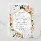 Elegant floral bat mitzvah invitation features an elongated hexagonal frame of watercolor flowers and foliage in boho desert inspired shades of peach, white, ivory, and sage green, and finished with gold foil trim. Personalize with your temple or synagogue ceremony and party details in modern lettering.