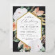Elegant floral christening invitation features an elongated hexagonal frame of watercolor flowers and foliage in boho desert inspired shades of peach, white, ivory, and sage green, and finished with gold foil trim. Personalize with your church ceremony and christening party details in modern lettering.