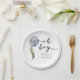 Modern and rustic balloon theme baby shower paper plate featuring watercolor illustration of a blue balloon with green garland. The text says "oh boy."