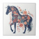 On this ceramic tile is a beautiful dark navy blue horse with boho style orange, blue, and pale yellow floral accents. The image is placed on a white background, with matching flower and leaf decorations surrounding it.