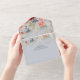ALSO AVAILABLE WITH A QR CODE TO SCAN IN THE RSVP AREA. This design features a dusty blue, pink, and red flower border with greenery. Personalized All-In-One invitations are a unique combination of both a beautifully printed custom invitation with an easy to tear off perforated RSVP postcard. And they are so easy to use! You simply fold, then seal the back flap with the three included clear stickers, and mail. And when your guests receive your custom invite, they just tear the perforated RSVP Card off and drop it back in the mail to you!