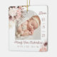 New baby birth stats photo Christmas ornament. The design features two photos, one photo on the front and one on the back. Display your new baby's photo. The date of birth is displayed along the side and the baby's name and birth stats along the bottom. Beautiful floral arrangements with boho bohemian style pink and white flowers with accents of lush brown leaves and palm leaves. Florals are arranged in beautiful bouquet arrangements to create this elegant floral design. Watercolor florals painted by Moodthology.