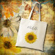 Boho botanical Yellow Sunflower bloom tote bag, with customizable black script typography. Enjoy this elegant accessory item for everyday use or as a gift for someone special.