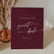 This boho chic burgundy red wedding guest book sign is perfect for a minimalist wedding. The dark maroon wine red modern bohemian design features simple rustic calligraphy with a unique yet classic style.
