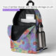 Introducing our vibrant and personalized floral printed backpack. A mesmerizing floral pattern adorns the entire surface, featuring a delightful blend of purple, orange, green, and blue hues. The intricate flowers and leaves create a lively mosaic that catches the eye. The background color is a soft grey, allowing the floral design to truly pop.