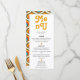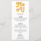 Boho chic 70's theme, menu card. Template provides space for names, date and three menu title headings with descriptions. Back of card features, trendy 70's style pattern in warm retro color palette.