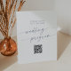 This boho chic slate blue QR code wedding program pedestal sign is perfect for a minimalist wedding. The pale dusty blue and white modern bohemian design features simple rustic calligraphy with a unique yet classic style.