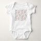This baby bodysuit has a Boho design of overlapping circles on retro pink, purple, moss green, and caramel orange.