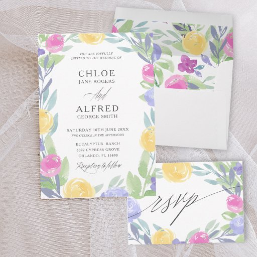 Boho Colorful Watercolor Rose & Foliage Wedding Invitation