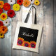 Boho floral tote bag, with a rustic daisies design on a black background. With white customizable script typography lettering you can add your own name. Great for adding a botanical style to your accessories.