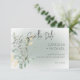 This save the date card design features a simple, soft top loose bouquet of botanical greenery with a white bow on a soft green blur oval and white background. It's delicate and elegant. Created by Simply Farmhouse Press, it is part of the Boho Delicate Greenery Modern Floral Wedding suite of cards.