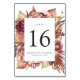 Elegant, desert floral wedding table number cards featuring burgundy, purple, blush, and coral watercolor flowers and lush foliage in rich brown earth tones.. Personalize by adding the table number, your names, wedding date, etc. Design repeats on reverse side. Coordinates with our Boho Desert Floral wedding invitation suite.