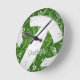 This boho volleyball themed wall clock features the realistic image of a volleyball with green & white panels that has a doodle pattern of paisleys, flowers and feathers in white covering the volleyball's green panels plus overlying clock face numerals - personalize with the athlete's name - by katz_d_zynes