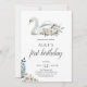Boho Dusty Blue Flower Swan 1st Birthday Invitation