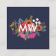 Monogrammed square business card in dark blue for an interior designer, event stylist, makeup artist or similar, featuring your initials in white atop a hand-drawn flower bouquet in orange, red, pink, and white.