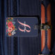 Monogrammed luggage tag in navy blue with your monogram in pink and white atop a floral arrangement of roses, pansies, and daisies in pink, orange, red, and white.