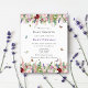 Feminine, summery and bohemian, this budget friendly baby shower invitation features a lovely garden of pink and purple watercolor flowers with butterflies and bumble bees flying around.