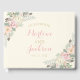 A soft ivory wedding guest book featuring delicate watercolor floral bouquets with roses, peonies, berries, and feather accents in blush, sage, and muted green corners. The couple's names in pink calligraphy and gold typography create a warm, vintage-inspired monogram design against the creamy background. Customize the couple's names and wedding date.