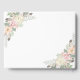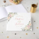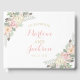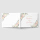 A romantic white wedding guest book featuring soft watercolor floral bouquets with roses, peonies, berries, and feather accents in blush, ivory, and sage green corners. The couple's names in pink calligraphy and gold typography create a beautifully layered monogram design. The back cover mirrors the floral corners for a coordinated look. Customize the couple's names and wedding date.