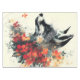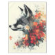 Mystical black and white fox portrait surrounded by vibrant and colorful flowers.