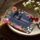 Colorful business card for an interior designer, event stylist, makeup artist or similar, featuring a frame of hand-drawn flowers against a dark blue background.