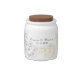 Vintage, elegant, boho wedding favor candy jar with bride and groom names, gilded silver and gold floral lace and modern calligraphy script.