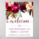 This trendy wedding welcome sign features pretty watercolor flowers in vibrant shades of marsala, wine, deep green, red, and purple, and matching modern typography.