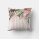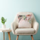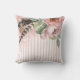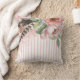 This lovely, feminine decorator pillow has a boho flair with pink and white stripes and large pink flowers with feathers on the front and back.
