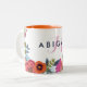 White mug printed with hand-drawn flower arrangements in hot pink, orange, coral red, and white. Add your monogram in cool pink and name in navy blue.