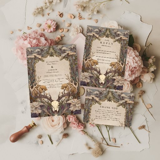 Bring woodland elegance to your fall celebration with this rustic antler wedding design. Framed by autumn leaves, branches, and deer antlers, it captures the spirit of nature and the romance of the harvest season. Perfect for countryside, lodge, or forest weddings.
