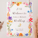 Boho garden summer floral monogram initials wedding welcome sign featuring pretty hand painted wildflowers in pink, yellow, blue, purple, red and orange, a frame of flowers with an elegant script typography.