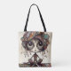 Make a bold statement with Boho Gaze, a stunning tote bag from the Fashionista Collection. Featuring a wide-eyed character adorned in a whimsically detailed headwrap of buttons, swirls, and color, this design blends dark whimsy with couture flair. Perfect for carrying your essentials in style, this bag is as unique as your fashion sense— edgy, artistic, and undeniably eye-catching.