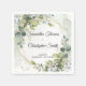 Simple boho design for wedding napkins features lavish watercolor green eucalyptus leaves mixed greenery foliage woven into faux gold frame. Elegant script typography.