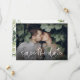 Chic modern wedding Save the Date cards with a two-sided design featuring your photos and text. On the front add your full bleed photo with a minimalist text overlay and hand lettering script font. The back side has space for all additional wedding details surrounded by a pretty botanical frame of boho watercolor greenery leaves and branches. Use the design tools to edit text fonts and colors or add more photos to design a unique Save the Date announcement for your wedding.