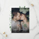 Chic modern wedding Save the Date cards with a two-sided design featuring your photos and text. On the front add your full bleed photo with a minimalist text overlay and hand lettering script font. The back side has space for all additional wedding details surrounded by a pretty botanical frame of boho watercolor greenery leaves and branches. Use the design tools to edit text fonts and colors or add more photos to design a unique Save the Date announcement for your wedding.