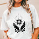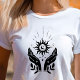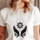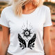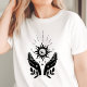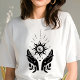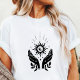 Embrace the celestial energy with this boho-inspired shirt featuring hands reaching towards a radiant sun and crescent moon. The minimalist design is adorned with leafy accents and cosmic details, creating a powerful visual statement. Perfect for those who love boho aesthetics and spiritual symbolism, this shirt combines nature, the cosmos, and a sense of empowerment. The black and white color scheme makes it versatile for any wardrobe, while the striking design adds an element of mystery and depth. Wear this shirt to channel positive vibes and celestial energy wherever you go.