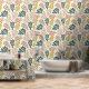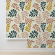 Earthy boho floral leaves pattern peel and stick wallpaper. Green, bisque and mustard on off white.