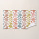 This towel set has a Boho design of pointy ovals in Boho shades pf pink, blue, gold, and brown.