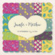 A cream colored heart shape graphic with faux stitched border is set against a floral patchwork quilt background on this paper coaster that has a warm, colorful look and is perfect for boho style weddings. The heart shape is ready to be personalized with the names of the bride and groom and their wedding date.