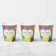 A cream colored heart shape graphic with faux stitched border is set against a floral patchwork quilt background on these paper cups that have a warm, colorful look and are perfect for boho style weddings. The heart shape is ready to be personalized with the names of the bride and groom and their wedding date.