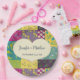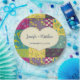 A cream colored heart shape graphic with faux stitched border is set against a floral patchwork quilt background on this paper plate that has a warm, colorful look and is perfect for boho style weddings. The heart shape is ready to be personalized with the name of the bride and groom and their wedding date.
