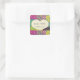 Add a personalized touch to wedding party favors with these custom stickers. A heart shape graphic is set against a colorful patchwork quilt background. Easily add your own names and wedding date to the heart.