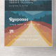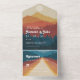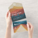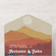 A trendy all-in-one wedding invitation with a retro vibe with white 1970's style font over a digital illustration of mountains and forests in terracotta, navy, mustard yellow and burnt orange.