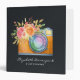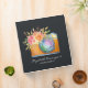 A personalized binder with a watercolor illustration of an orange camera and a floral bouquet resting on top. The flowers in the bouquet are light pink and orange with green leaves, a pretty floral arrangement.Dark gray background.