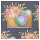 Fabric with a repeating pattern featuring a watercolor illustration of an orange camera and a floral bouquet resting on top. The flowers in the bouquet are light pink and orange with green leaves, a pretty floral arrangement.