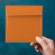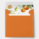A boho orange color square envelope. The inside is coordinated with watercolor pattern of oranges,lemons and blossoms. Personalize with your return address label on the back flap