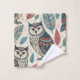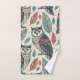 This bathroom towel set features a boho pattern of teal, rust and gray owl illustrations outlined in black and surrounded by autumn leaves in coordinating colors on a beige background.
