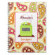 A recipe notebook featuring an illustration of a bright green retro stove inside a rectangle over a background of pink, green, orange, gold, and burgundy paisley. Personalize with your name.