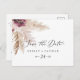 This boho pampas grass save the date postcard is perfect for a summer wedding. The floral watercolor design features bohemian burgundy and blush pink flowers with sprigs of neutral pampas grass and golden dried palm leaves.